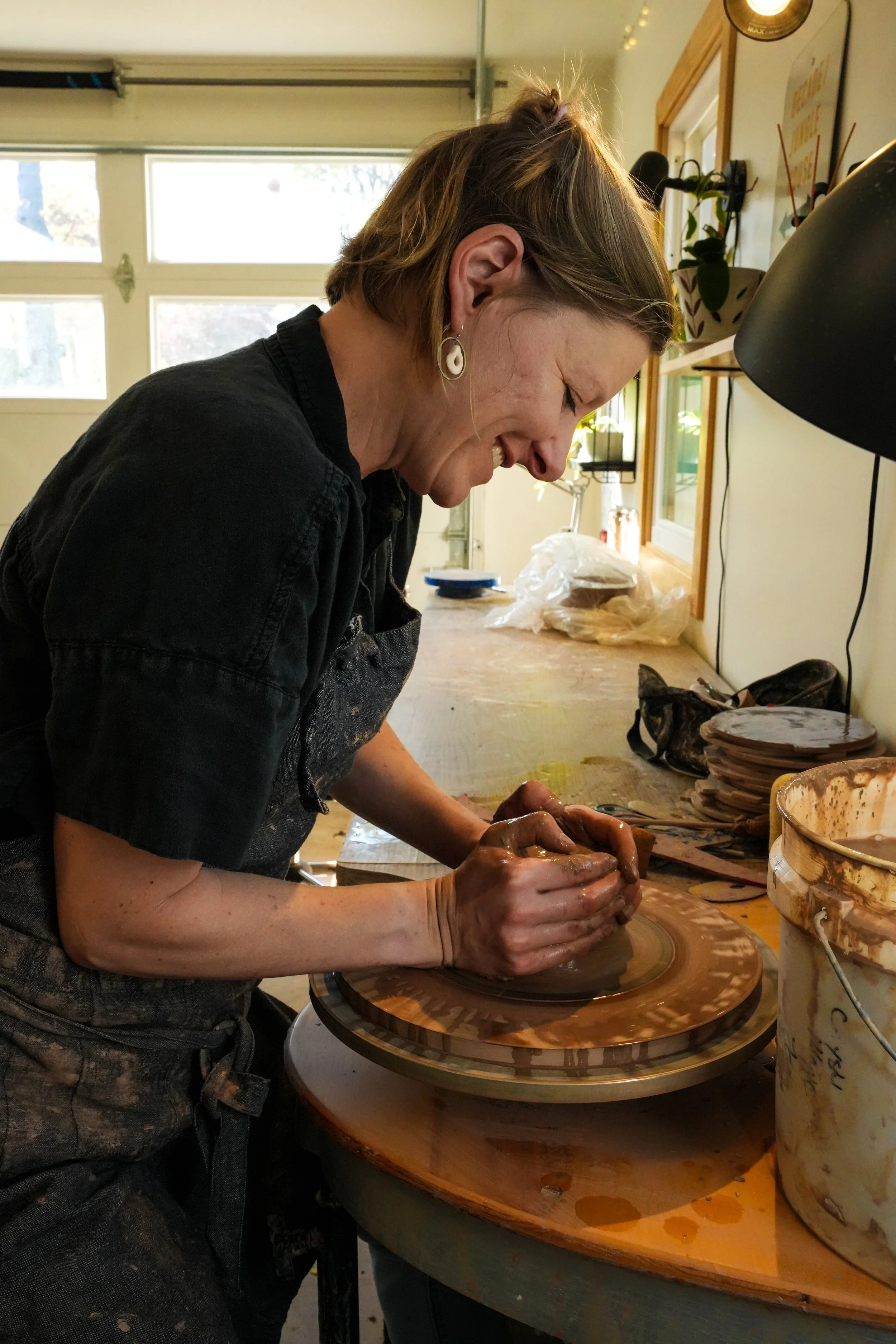 Currently, she makes pots in her freshly renovated (and not quite finished) studio. Her recent pots are heavily influenced by her study of Bronze Age Greek pottery.